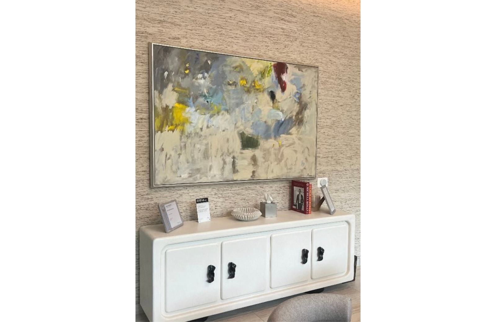 "Red Rooster", By Bradford Brenner, channels emotion and introspection through bold abstraction—muted grays collide with vibrant reds and blues to evoke resilience and transformation. The work embodies the spirit of the rooster, expressing defiance and vulnerability through gesture rather than form.